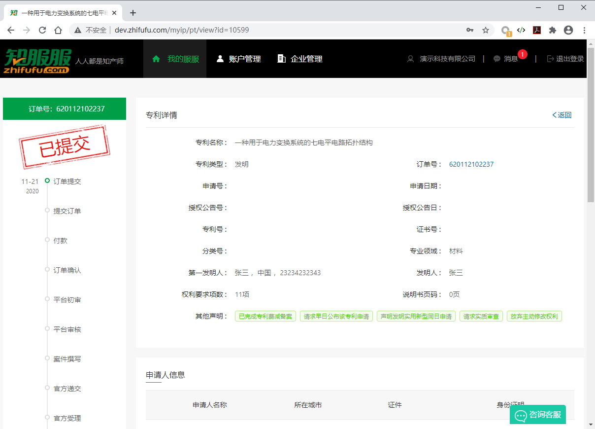 登录平台我的服服,可以查看所有下单的软著、作品、商标、专利申请数据。云端知产管理软件,进行全生命周期业务管理。支持小程序实时查看知识产权申请、授权数据,在线查看证书。